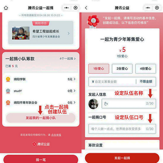 2024年9月5日-9日,每天早上10:00開始,公眾為公益項目捐贈不低于1元,有機會獲得騰訊基金會提供的隨機金額配捐,每個捐贈人每天只能獲得1次配捐,配捐金額不高于9。99元。
