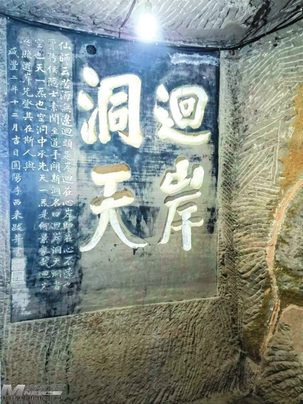 尋樂書巖的書法精品匯聚在第三層石室“回岸洞天”,這里四壁皆是書法作品,琳瑯滿目,字體疏異,猶如一座書法展廳。對窗石壁上書刻“回岸洞天”四個(gè)陰文大字,是曾教過道光皇帝的四川名儒李嘉秀所題,寫得氣勢恢宏,鑿得精美細(xì)膩,半圓柱的陰刻筆道中能塞進(jìn)一個(gè)拳頭,表達(dá)出苦海無邊、回頭是岸的釋家思想。