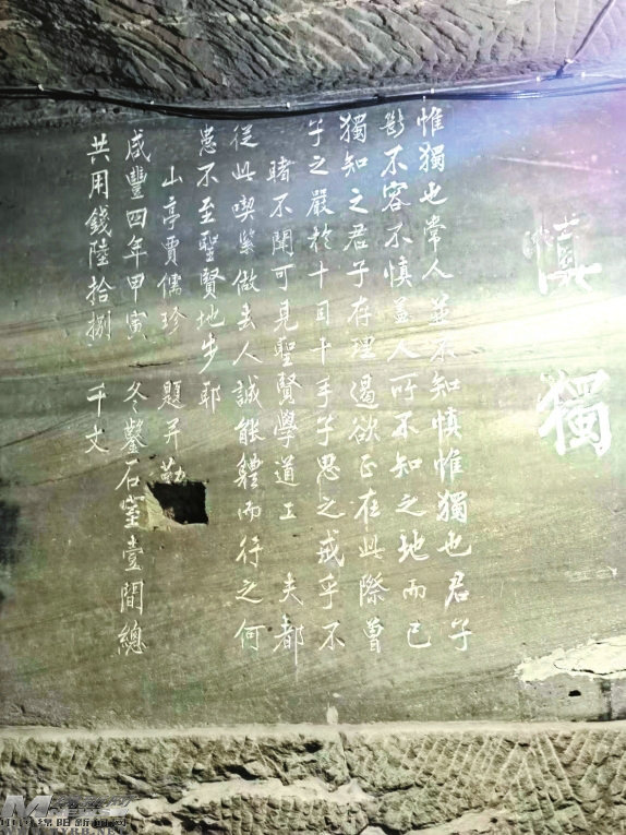 進(jìn)入第二層,只見東壁上刻“主敬”“慎獨(dú)”四個(gè)紅色大字。“主敬”來自程朱理學(xué),程頤、朱熹都講主敬,強(qiáng)調(diào)居敬、持敬,認(rèn)為這是萬善之本,是為學(xué)的綱領(lǐng)。“慎獨(dú)”兩個(gè)大字旁邊有十行行書題跋以釋其義,共140字,這是賈儒珍當(dāng)年親筆所刻。“慎獨(dú)”出自《大學(xué)》:“此謂誠於中,形於外,故君子必慎其獨(dú)也。”告誡人們在獨(dú)處之時(shí)要格外注重個(gè)人的道德品質(zhì)修養(yǎng),不能只做表面功夫給他人看。“主敬”“慎獨(dú)”等大字昭示著洞窟主人高尚的人格追求,也激勵警醒著參觀者。