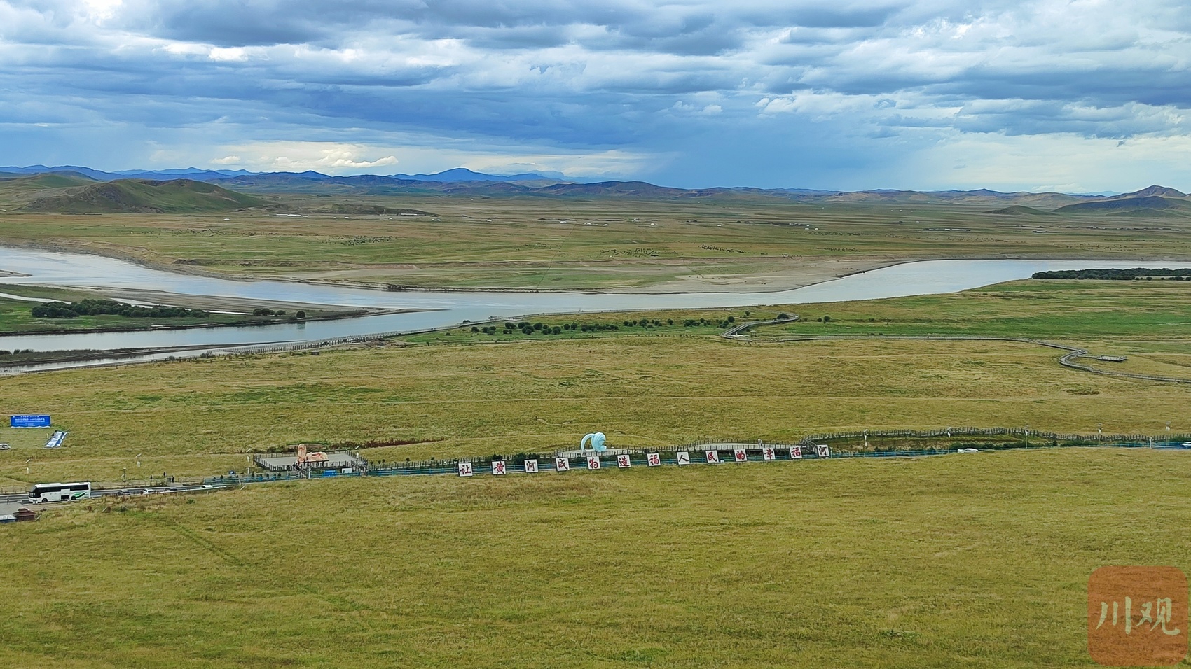 9月6日,阿壩藏族羌族自治州若爾蓋縣唐克鎮(zhèn)的一處草場里,當(dāng)?shù)剞r(nóng)牧民攝影大賽的作品正在這里展出。部分藏族群眾身著節(jié)日盛裝,載歌載舞。不遠(yuǎn)處,黃河拐過“九曲第一灣”,穿行在草原間。