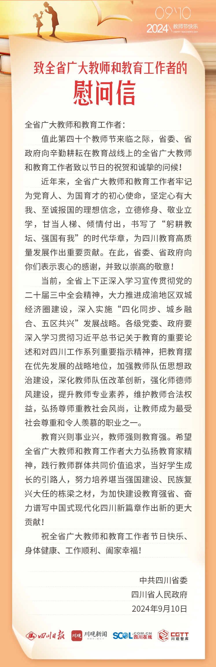 近年來(lái),全省廣大教師和教育工作者牢記為黨育人、為國(guó)育才的初心使命,堅(jiān)定心有大我、至誠(chéng)報(bào)國(guó)的理想信念,立德修身、敬業(yè)立學(xué),甘當(dāng)人梯、傾情付出,書(shū)寫了“躬耕教壇、強(qiáng)國(guó)有我”的時(shí)代華章,為四川教育高質(zhì)量發(fā)展作出重要貢獻(xiàn)。在此,省委、省政府向你們表示衷心的感謝,并致以崇高的敬意!