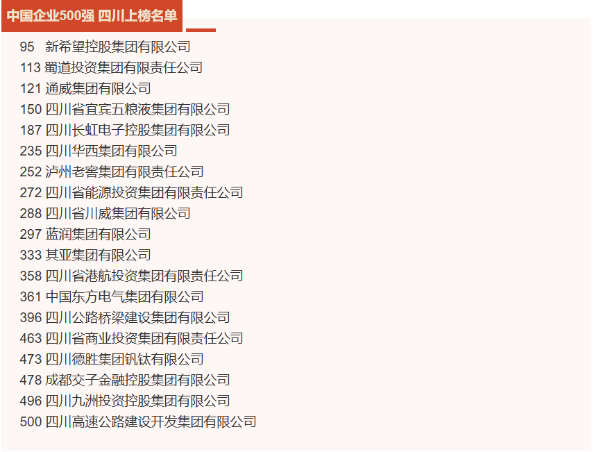9月11日,中國企業(yè)聯(lián)合會、中國企業(yè)家協(xié)會發(fā)布“2024中國企業(yè)500強”榜單,四川共有19家企業(yè)上榜,較上年新增4家入圍企業(yè),是新增企業(yè)數(shù)量最多的省份。