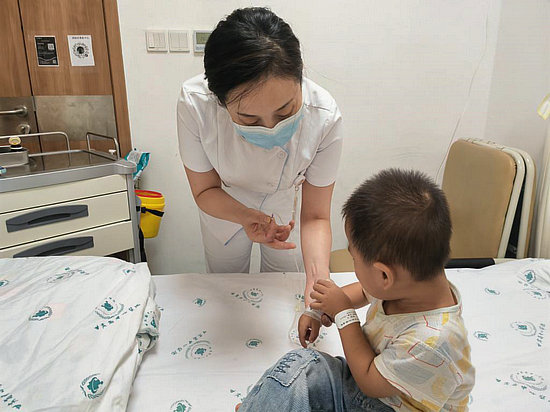 9月10日,甘肅省婦幼保健院(甘肅省中心醫(yī)院)護(hù)理人員為一名2歲脈管畸形兒童靜脈輸液。新華社記者梁軍 攝