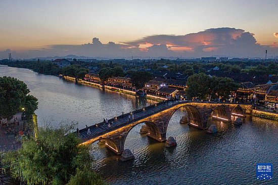 9月13日,空中俯瞰塘棲廣濟(jì)橋和大運(yùn)河(無(wú)人機(jī)照片)。