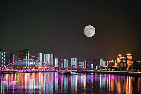 9月17日晚,一輪明月緩緩升起,宛如一個(gè)白玉盤,月光灑在三江兩岸,與絢麗的燈光,組成了一幅溫情畫卷(兩次曝光合成)。(記者 王勇 攝)