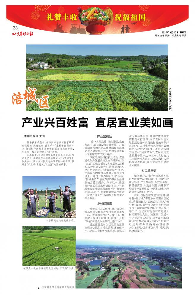 9月20日,《四川農(nóng)村日報》推出“禮贊豐收 祝福祖國”2024年中國農(nóng)民豐收節(jié)特別報道,展現(xiàn)四川省建設(shè)新時代更高水平“天府糧倉”取得的顯著成效,其中多個版面重點關(guān)注了綿陽推進鄉(xiāng)村振興、以新質(zhì)生產(chǎn)力推進農(nóng)業(yè)高質(zhì)量發(fā)展的創(chuàng)新舉措、生動實踐。全文如下: