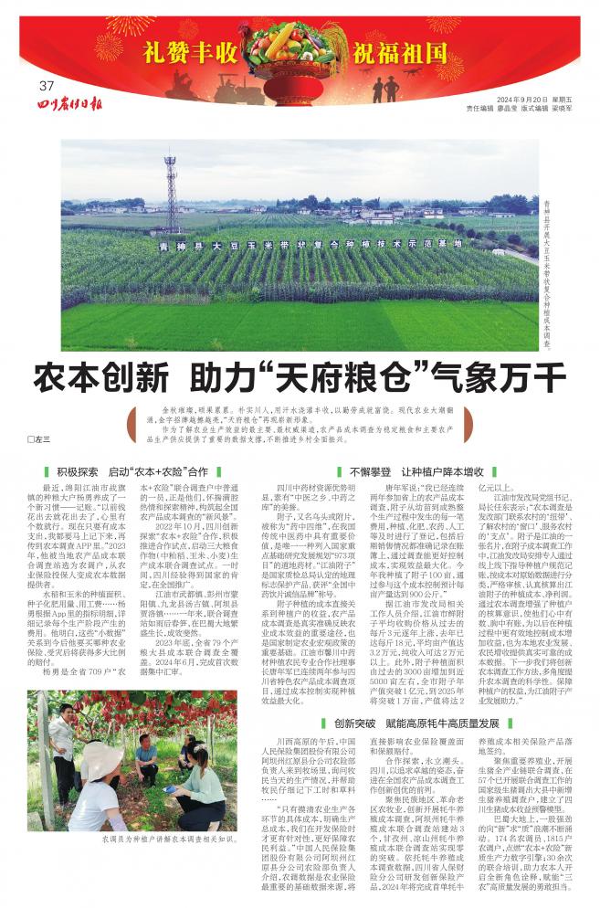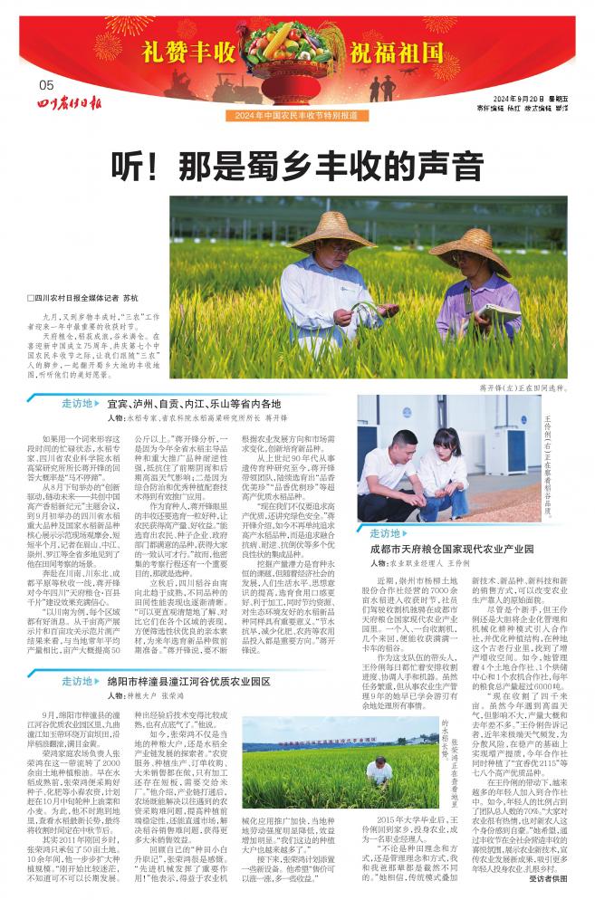 摘要:9月20日,《四川農(nóng)村日報》推出“禮贊豐收 祝福祖國”2024年中國農(nóng)民豐收節(jié)特別報道,展現(xiàn)四川省建設(shè)新時代更高水平“天府糧倉”取得的顯著成效,其中多個版面重點關(guān)注了綿陽推進鄉(xiāng)村振興、以新質(zhì)生產(chǎn)力推進農(nóng)業(yè)高質(zhì)量發(fā)展的創(chuàng)新舉措、生動實踐。