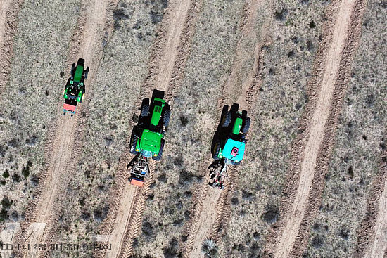 ?。对拢保度眨瑑?nèi)蒙古巴彥淖爾市烏拉特后旗西補(bǔ)隆林業(yè)管護(hù)中心職工駕駛機(jī)械壓沙障。新華社記者 李云平 攝