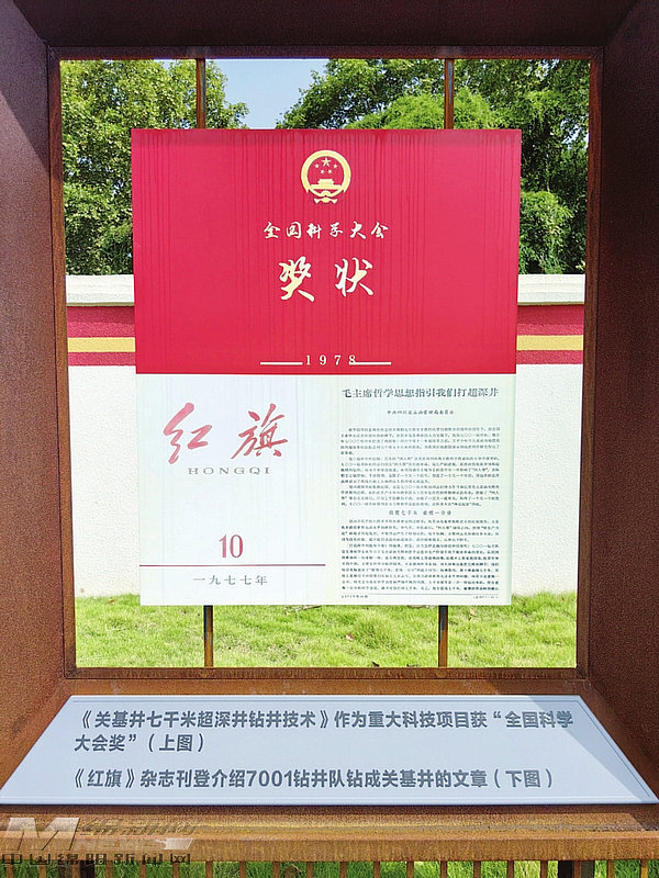 在小院外右側(cè)圍墻上,是關(guān)基井的地理位置、問世時(shí)間、獲得榮譽(yù)等的簡介。簡介記載,關(guān)基井于1974年12月17日開鉆,1977年12月4日完鉆,井深7175米,保持亞洲第一深井紀(jì)錄長達(dá)25年,創(chuàng)造了我國鉆進(jìn)深度最深、地層壓力最高等10項(xiàng)紀(jì)錄,榮獲“全國科學(xué)大會(huì)獎(jiǎng)”“四川省科學(xué)技術(shù)獎(jiǎng)一等獎(jiǎng)”等,讓中國成為世界上第四個(gè)能鉆探7000米以上超深井的國家,是一口名副其實(shí)的“爭氣井”。