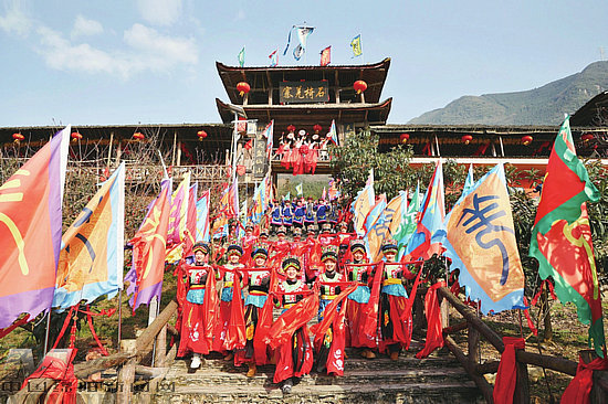 游客走出車(chē)門(mén)的一刻,鑼鼓、嗩吶和羌族民歌潮水般涌來(lái)。寬闊的青石階梯天梯般直達(dá)由杉皮和松木桿搭建的寨門(mén)。階梯兩邊,身穿羌袍的羌族男女以最熱烈的大紅、桃紅和湖藍(lán)肆無(wú)忌憚地展示著自己大雅大俗之美。路行一半,熱情的主人已經(jīng)迎上來(lái),獻(xiàn)羌紅,敬咂酒。