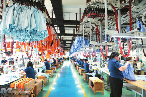 在大多數(shù)人印象中,服裝紡織行業(yè)屬于傳統(tǒng)工業(yè)中的勞動(dòng)密集型產(chǎn)業(yè)。然而,記者在現(xiàn)場(chǎng)看到,第四車間已經(jīng)引入了一條自動(dòng)智能吊掛生產(chǎn)線,上一個(gè)環(huán)節(jié)的工人只需把半成品掛到吊掛機(jī)上,就自動(dòng)運(yùn)輸?shù)较乱粋€(gè)工序進(jìn)行下一步的生產(chǎn)。
