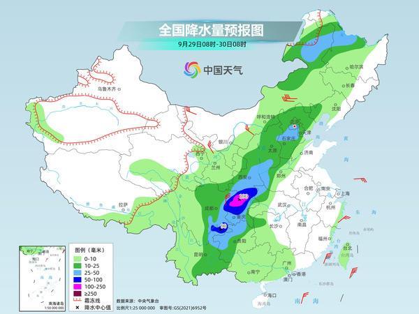 9月29日至30日仍將處于本輪降水過程的主要影響時段內(nèi),陜西南部到四川東部、重慶、貴州一帶有強(qiáng)降雨,其中29日四川盆地中東部部分地區(qū)有暴雨或大暴雨,這樣的降水強(qiáng)度在同期是少見的。另外,甘肅、青海等部分地區(qū)或?qū)⒊霈F(xiàn)降雪。