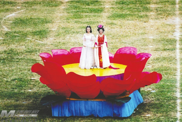 在綿陽舉行的第四屆全國農(nóng)民運動會開幕式上,中國戲劇梅花獎得主喻海燕、蔣淑梅同臺獻藝。(曾巨光攝于2000年)