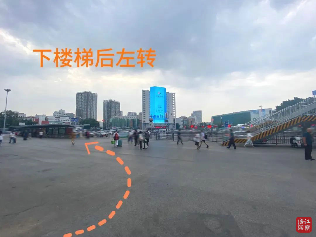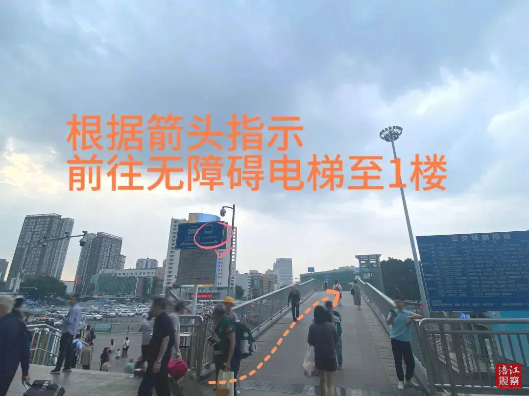 到達(dá)綿陽站出站口,根據(jù)指示牌“公交車乘車點”,向右前方通過天橋,乘坐無障礙電梯到達(dá)一樓,左轉(zhuǎn)步行至免費304空港專線乘車。