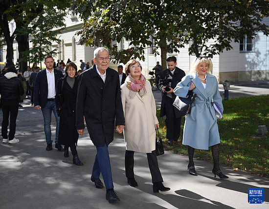 9月29日,奧地利總統(tǒng)范德貝倫(前左)前往維也納的一處投票站投票。新華社記者 賀燦鈴 攝