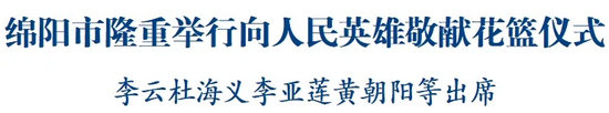 黃朝陽主持敬獻(xiàn)花籃儀式。市委、市人大常委會(huì)、市政府、市政協(xié)領(lǐng)導(dǎo),科技城黨工委有關(guān)領(lǐng)導(dǎo),市中級(jí)法院院長、市檢察院檢察長,駐綿部隊(duì)有關(guān)領(lǐng)導(dǎo),市直部門、民主黨派、工商聯(lián)、無黨派人士及科學(xué)城辦事處代表,烈士遺屬、志愿軍老戰(zhàn)士、老同志和退役軍人代表,師生代表、企業(yè)職工代表、消防員代表和駐綿部隊(duì)官兵代表,涪城區(qū)黨、政、軍和人民團(tuán)體負(fù)責(zé)人及各界群眾代表等參加。