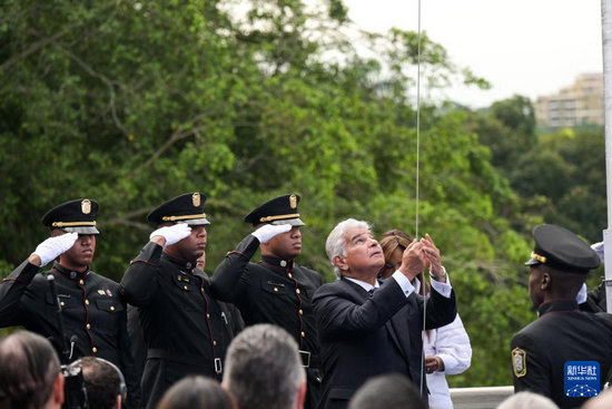 12月31日,巴拿馬總統(tǒng)穆利諾(中)在首都巴拿馬城舉行的正式收回巴拿馬運河主權25周年紀念活動上升起國旗。新華社記者 陳昊佺 攝