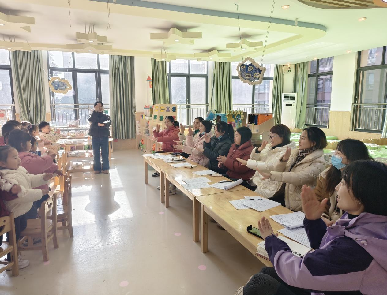 活動(dòng)當(dāng)天,上午時(shí)段,中青年教師馮芹與汪麗娟分別在中一班和中二班開展了區(qū)域游戲活動(dòng)。她們緊密圍繞當(dāng)前主題,投放了多元化的材料,引導(dǎo)幼兒通過分組計(jì)劃、討論、實(shí)施及回顧等環(huán)節(jié),自主選擇、沉浸探究,滿足個(gè)性化需求。教師們細(xì)心觀察、認(rèn)真記錄,并在適宜時(shí)機(jī)介入指導(dǎo),助力幼兒在游戲中成長。隨后,杜景晨老師的音樂活動(dòng)《中國拉面館》,通過生動(dòng)的表演和歡快的節(jié)奏,讓孩子們感受到了音樂的無限魅力。