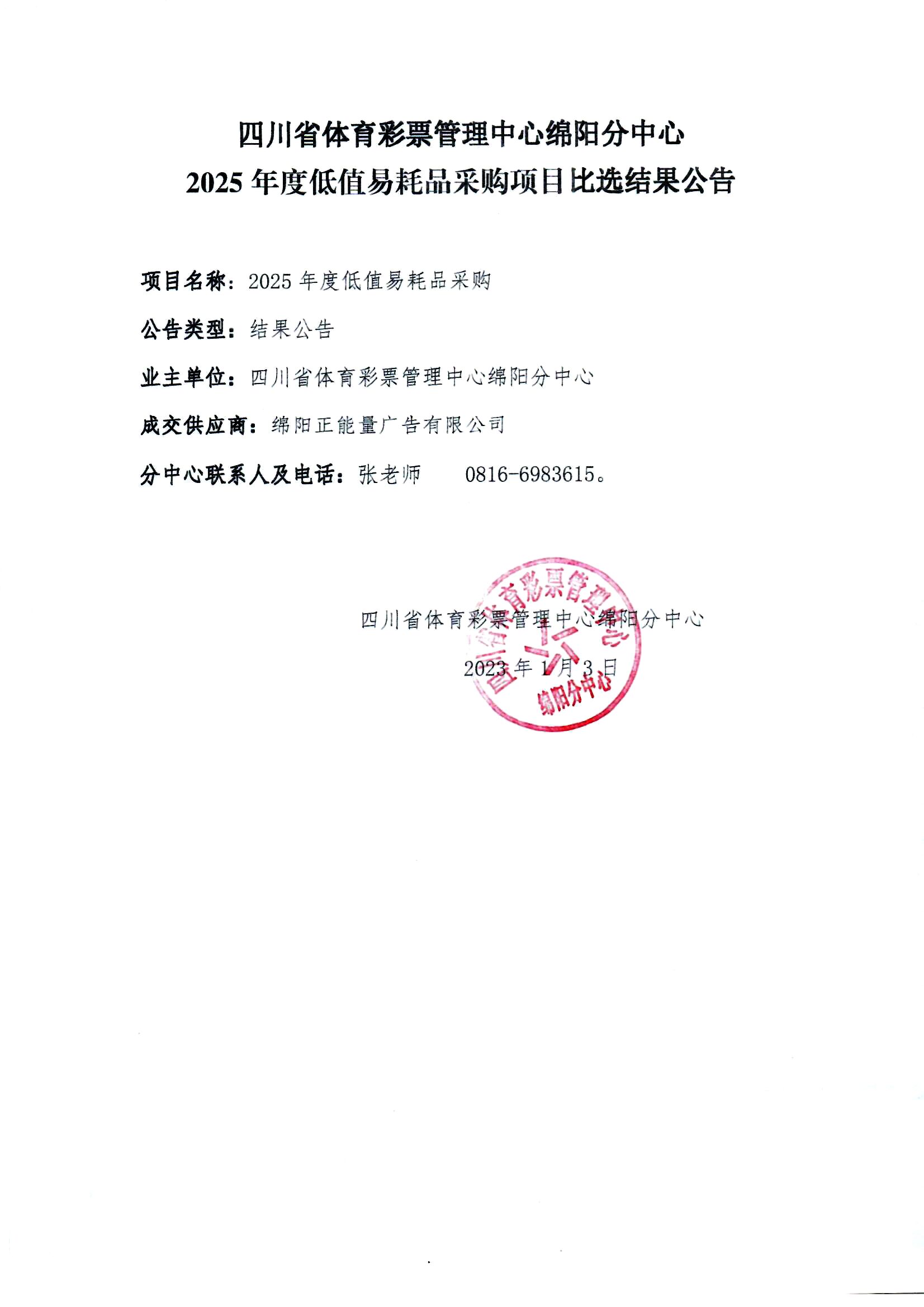 四川省體育彩票管理中心綿陽分中心2025年度低值易耗品采購項(xiàng)日比選結(jié)果公告