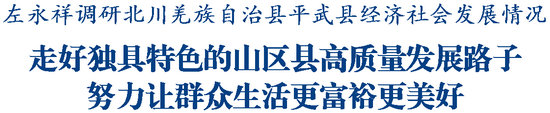 調(diào)研過程中,左永祥聽取了兩縣貫徹落實中央和省委經(jīng)濟(jì)工作會議精神、市委八屆九次全會精神,以及今年工作打算等情況匯報,對取得的工作成效給予肯定。他強(qiáng)調(diào),北川和平武都屬于山區(qū)縣,發(fā)展縣域經(jīng)濟(jì)大有可為,也要有大作為,要找準(zhǔn)定位,聚焦用力,立足資源稟賦,發(fā)揮比較優(yōu)勢,強(qiáng)化改革賦能,切實把獨特的民族文化特色、優(yōu)良的山水生態(tài)資源轉(zhuǎn)化為現(xiàn)實生產(chǎn)力和發(fā)展競爭力,以奮發(fā)有為的精神狀態(tài)推動各項工作邁上新臺階。要樹立生態(tài)優(yōu)先綠色發(fā)展理念,扎實抓好生態(tài)修復(fù)和環(huán)境保護(hù),堅持產(chǎn)業(yè)生態(tài)化、生態(tài)產(chǎn)業(yè)化,高質(zhì)量推進(jìn)“森林四庫”建設(shè),不斷培育壯大綠色低碳優(yōu)勢產(chǎn)業(yè),推進(jìn)人與自然和諧共生的現(xiàn)代化。要做實做好文旅融合、農(nóng)旅融合文章,將文化遺跡、特色建筑、民間技藝、山水風(fēng)光等文旅IP資源進(jìn)行深入挖掘開發(fā),形成新的經(jīng)濟(jì)增長點。要扎實做好歲末年初各項工作,用心用情做好民生保障,全面加強(qiáng)重點領(lǐng)域安全生產(chǎn)和森林草原防滅火工作,堅決消除各類安全隱患,多措并舉強(qiáng)化基層應(yīng)急能力建設(shè)和實戰(zhàn)化演練,切實提高防災(zāi)減災(zāi)救災(zāi)能力,以高水平安全保障高質(zhì)量發(fā)展。要堅持大抓基層的鮮明導(dǎo)向,樹牢“抓與不抓完全不一樣”理念,充分發(fā)揮黨建的引領(lǐng)力、凝聚力、戰(zhàn)斗力,完善提升網(wǎng)格化治理,從嚴(yán)從實抓好干部隊伍建設(shè),培養(yǎng)務(wù)實過硬作風(fēng),激發(fā)擔(dān)當(dāng)作為、干事創(chuàng)業(yè)的精氣神,更好服務(wù)基層、服務(wù)群眾。