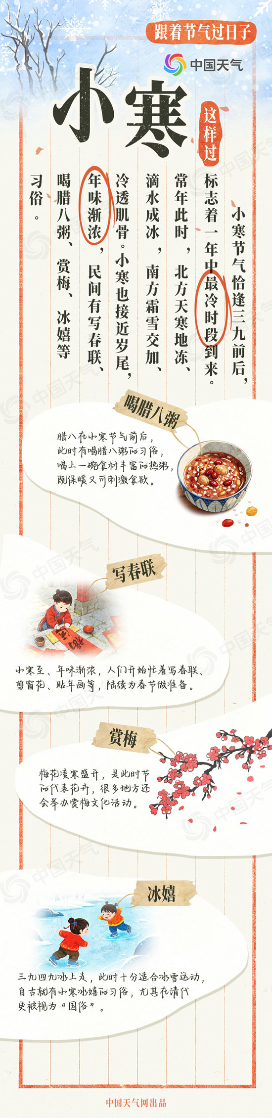 春生夏長(zhǎng),秋收冬藏,跟著節(jié)氣過(guò)日子,今天(1月5日)進(jìn)入冬天的第五個(gè)節(jié)氣——小寒。小寒節(jié)氣恰逢三九前后,標(biāo)志著一年之中最寒冷的時(shí)段到來(lái)。小寒也接近歲尾,年味漸濃,民間有寫春聯(lián)、喝臘八粥、賞梅、冰嬉等習(xí)俗。中國(guó)天氣網(wǎng)推出小寒風(fēng)俗圖鑒和小寒全國(guó)天氣地圖,看看這個(gè)節(jié)氣怎么過(guò)。