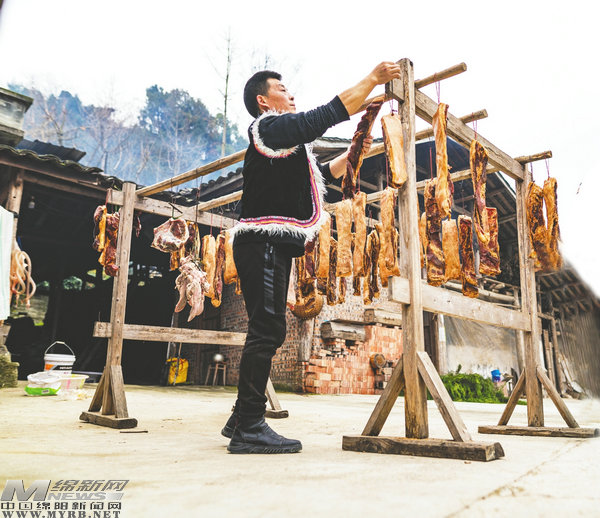 一排排肥瘦均勻的香腸、一根根腌制入味的臘豬腳,整齊掛在屋檐下……近段時間,北川羌族自治縣各地村民相繼開始宰殺年豬,準備制作臘味。北川臘肉傳統(tǒng)制作技藝歷史悠久,經(jīng)過煙火熏制的臘肉香味四溢、肥而不膩,既是村民逢年過節(jié)招待親朋好友的特色佳肴,也是當?shù)卦鍪罩赂坏奶厣a(chǎn)業(yè)。