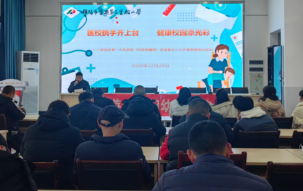 為了進(jìn)一步普及急救知識(shí),提高全體教職工應(yīng)對(duì)突發(fā)事件的反應(yīng)及處置能力。2024年12月24日,綿陽(yáng)市富樂第三實(shí)驗(yàn)小學(xué)聯(lián)合游仙區(qū)第一人民醫(yī)院,開展了2024年秋急救知識(shí)進(jìn)校園活動(dòng)。本次活動(dòng)旨在通過專業(yè)知識(shí)講解與實(shí)際操作,讓老師們掌握基本的心肺復(fù)蘇及海姆立克急救法,營(yíng)造安全和諧的校園環(huán)境。