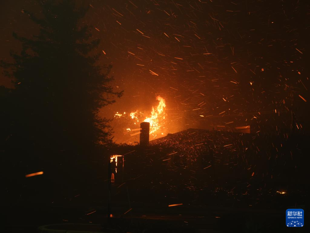 1月7日,在美國加利福尼亞州南部洛杉磯縣沿海社區(qū)帕西菲克帕利塞茲,野火吞噬房屋。新華社發(fā)(邱晨攝)