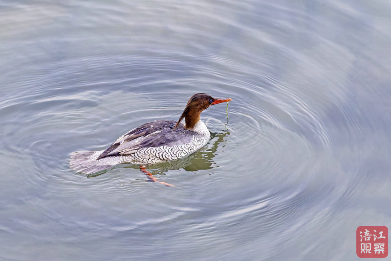 記者跟隨觀鳥(niǎo)愛(ài)好者們來(lái)到了涪江水域,在一處水質(zhì)清澈、水草豐茂的河段,觀鳥(niǎo)愛(ài)好者尚召楊發(fā)現(xiàn)了一只外形獨(dú)特、羽色艷麗的鳥(niǎo)類(lèi)正在覓食、嬉戲。通過(guò)高倍單筒望遠(yuǎn)鏡觀測(cè),該水鳥(niǎo)頭部有羽冠,嘴長(zhǎng)而窄,呈桔紅色,兩脅和胸側(cè)有黑色鱗狀斑,經(jīng)鑒定為國(guó)家一級(jí)保護(hù)動(dòng)物——中華秋沙鴨。