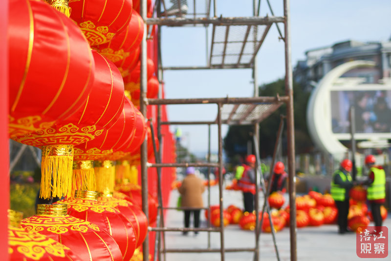 1月14日,記者在崇文廣場看到,掛燈現(xiàn)場一片繁忙景象,工人們身穿安全工作服,一絲不茍地進(jìn)行著燈籠懸掛工作。