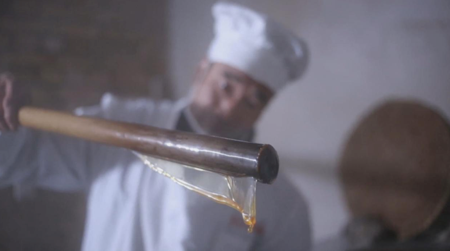 炒糖時(shí),一開(kāi)始先用棍攪,攪不動(dòng)以后用木鏟鏟,直到炒出一些大凝泡以后,這糖就算炒好了。等糖冷卻到一定程度,就可以制作糖瓜了。制作糖瓜時(shí),要防止糖在低溫下變硬。所以要直接在鍋上利用熱氣扯糖,借著水汽的滋潤(rùn),鍋前的張克明父子將熬好的糖拿出一塊,掛在木鉤上,開(kāi)始用手拉扯,焦黃的麥芽糖隨著水蒸氣不斷的熏蒸,在連續(xù)拉扯幾十次后變得松軟而潔白。