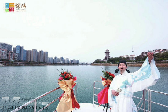 “李白”手持書(shū)卷出現(xiàn)在夜游涪江啟動(dòng)儀式上,與游客互動(dòng)。