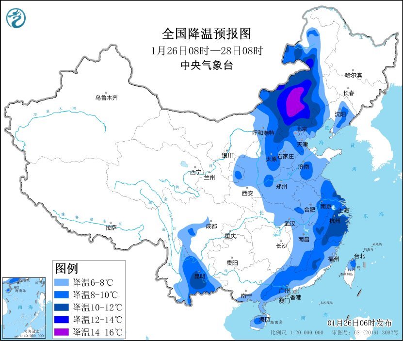 預(yù)計,1月26日08時至28日08時,內(nèi)蒙古中東部、西北地區(qū)東北部、華北大部、黃淮、江淮、江南中東部、華南中東部、云南中東部、川西高原南部等地氣溫將下降6~10℃,其中,內(nèi)蒙古中東部的部分地區(qū)降溫幅度可達12℃以上。
