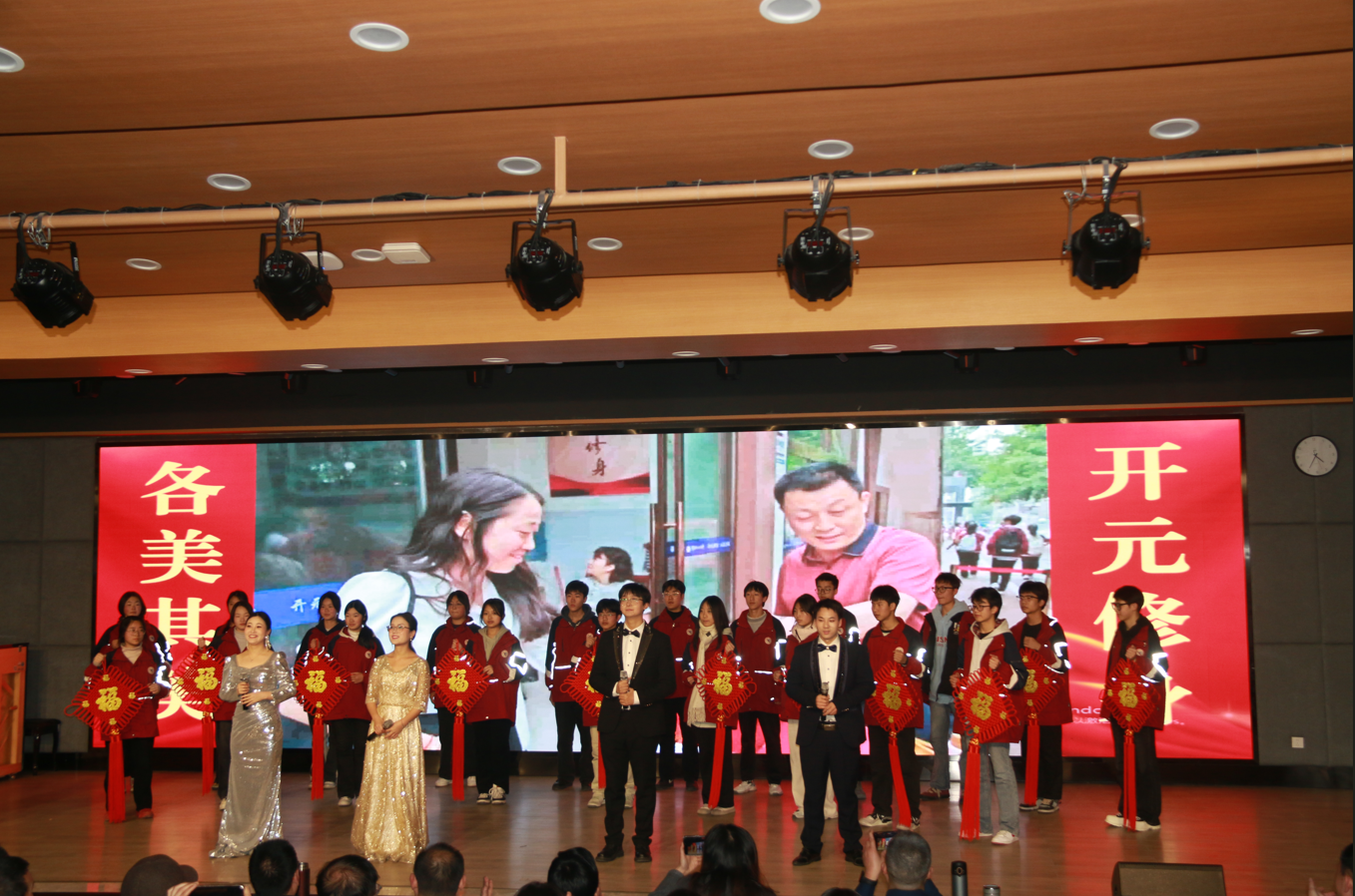 “迎新春文娛活動”在高三教師劉德升、戚旗和高三學(xué)子同臺表演的歌舞《APT阿帕特》中拉開帷幕,充滿現(xiàn)代氣息的開場舞瞬間點燃現(xiàn)場熱烈的氣氛;該校工會副主席鮮紅艷演唱的歌曲《好運來》,為全體教職工送上美好祝福;高一音樂教師鄒李帶來的笛子獨奏《前世今生》,旋律優(yōu)美、曲調(diào)悠揚,笛聲如同一股清流讓全場觀眾感到無盡的舒適和放松;初中部音樂教師顧歡歡帶來的《鋼琴串燒》,琴聲時而緩慢優(yōu)雅,時而剛勁有力,顧老師以其扎實的演奏功底為老師們帶來了一場精彩絕倫的視聽盛宴;高二教師張穎、王治玲、張永志、朱文宇和高二學(xué)子帶來歌曲《如愿》,讓大家在畫面中見證了高二師生奮力拼搏的身影,在歌聲中感受到高二師生的執(zhí)著與夢想。