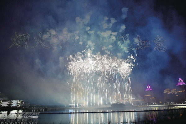 無(wú)人機(jī)集結(jié)金西湖畔上空,呈現(xiàn)出“煙火綿州巳巳如意”圖案。