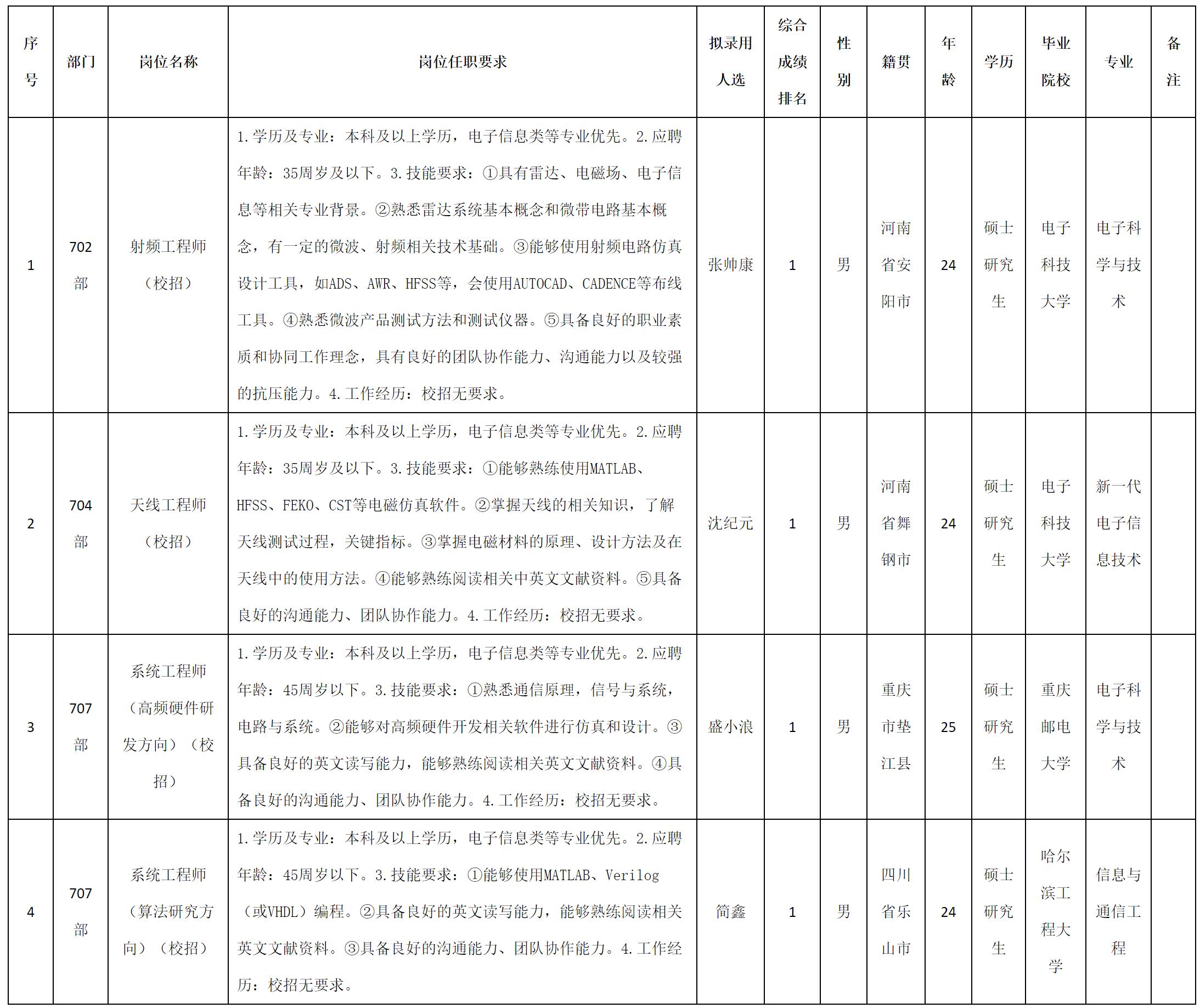 根據(jù)四川九洲電器集團(tuán)有限責(zé)任公司發(fā)布的招聘公告及招聘相關(guān)規(guī)定,經(jīng)測試、考察、體檢等程序,擬錄用張帥康等4名同志到四川九洲電器集團(tuán)有限責(zé)任公司工作,現(xiàn)予以公示,具體情況如下: