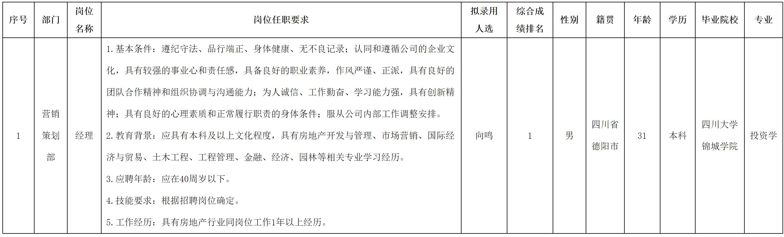 根據(jù)四川波鴻實業(yè)有限公司發(fā)布的招聘公告及招聘相關規(guī)定,經面試、體檢等程序,擬錄用向鳴同志到綿陽萬鴻房地產開發(fā)有限公司工作,現(xiàn)予以公示,具體情況如下: