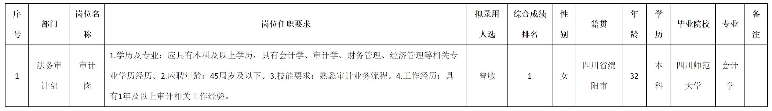 根據(jù)四川九州光電子技術(shù)有限公司發(fā)布的招聘公告及招聘相關(guān)規(guī)定,經(jīng)測試、考察、體檢等程序,擬錄用曾敏同志到四川九州光電子技術(shù)有限公司工作,現(xiàn)予以公示,具體情況如下: