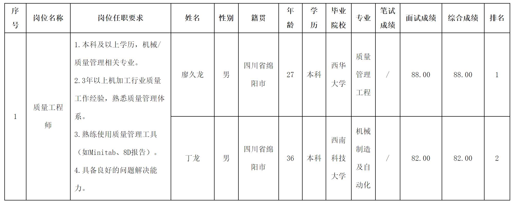 根據(jù)四川波鴻實業(yè)有限公司發(fā)布的招聘公告及招聘相關(guān)規(guī)定,現(xiàn)將測試成績予以公示。