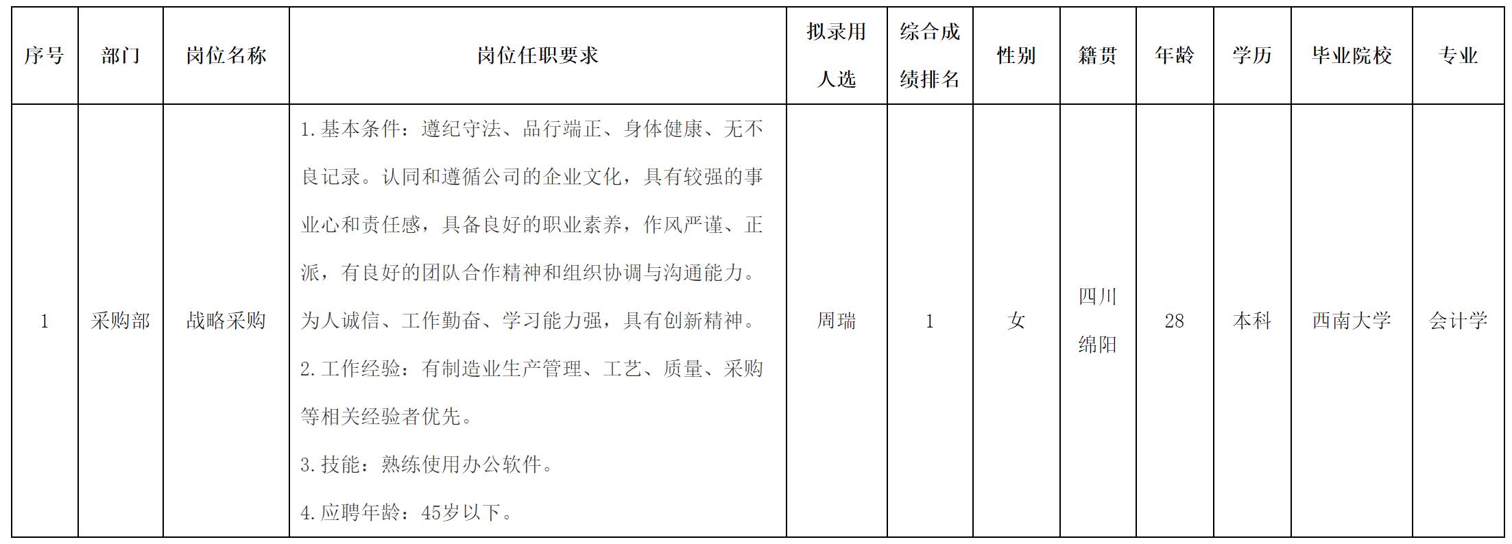 根據(jù)四川長(zhǎng)虹空調(diào)有限公司發(fā)布的招聘公告及招聘相關(guān)規(guī)定,經(jīng)面試,擬錄用周瑞到長(zhǎng)虹空調(diào)工作,現(xiàn)予以公示,具體情況如下: