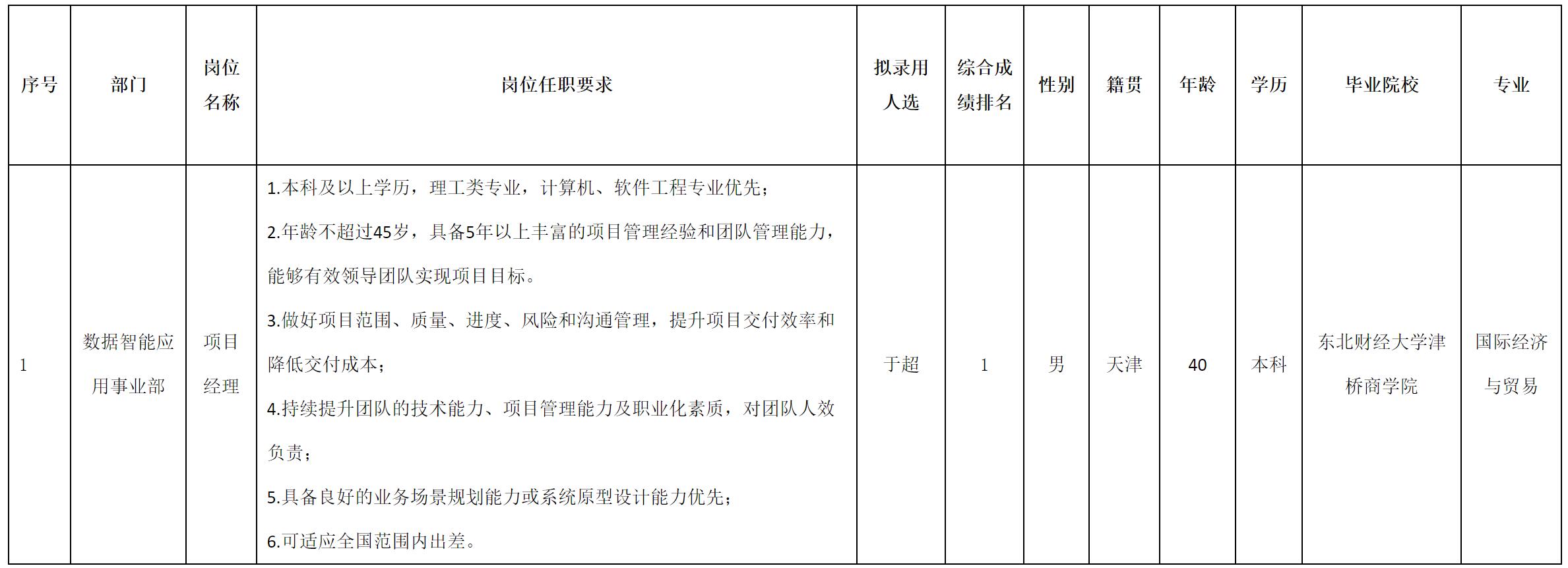 根據(jù)四川虹信軟件股份有限公司發(fā)布的招聘公告及招聘相關(guān)規(guī)定,經(jīng)測試、考察、體檢等程序,擬錄用于超同志到四川虹信軟件股份有限公司工作,現(xiàn)予以公示,具體情況如下: