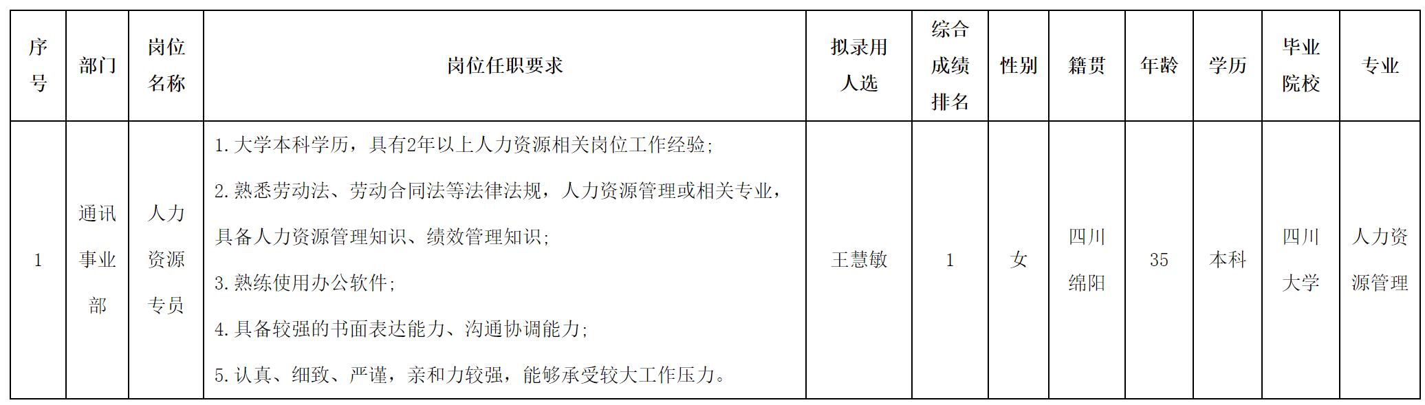 根據(jù)四川華豐科技股份有限公司發(fā)布的招聘公告及招聘相關(guān)規(guī)定,經(jīng)測試等程序,擬錄用王慧敏同志到四川華豐科技股份有限公司工作,現(xiàn)予以公示,具體情況如下:
