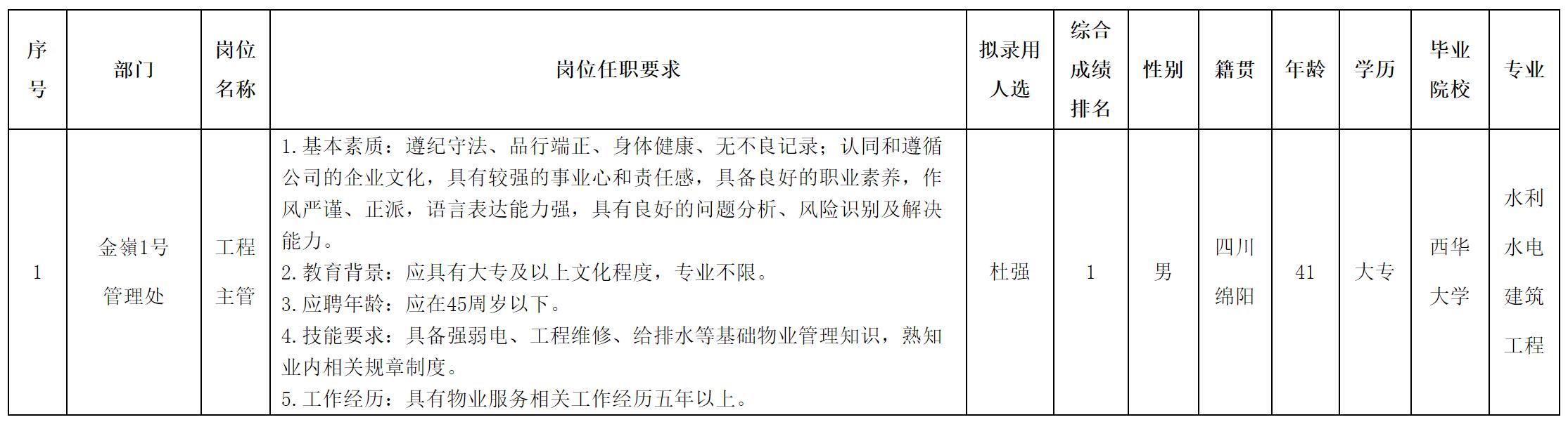 根據(jù)四川長(zhǎng)虹物業(yè)服務(wù)有限責(zé)任公司綿陽分公司發(fā)布的招聘公告及招聘相關(guān)規(guī)定,經(jīng)面試、考察、體檢等程序,擬錄用杜強(qiáng)同志到金嶺1號(hào)管理處工作,現(xiàn)予以公示,具體情況如下: