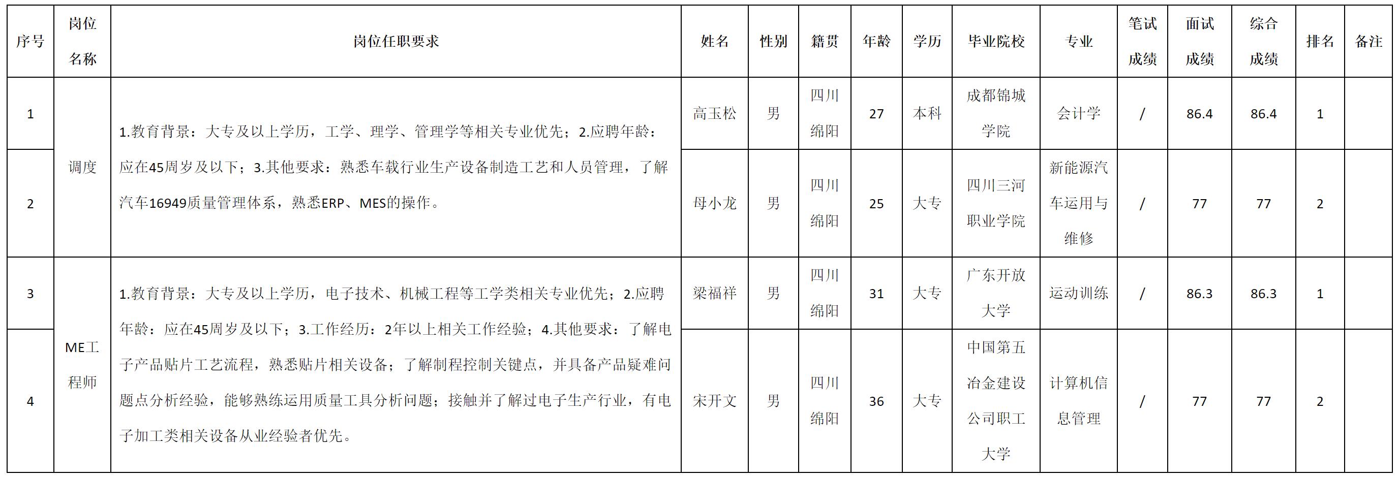 根據(jù)四川九州電子科技股份有限公司發(fā)布的招聘公告及招聘相關規(guī)定,現(xiàn)將測試成績予以公示。