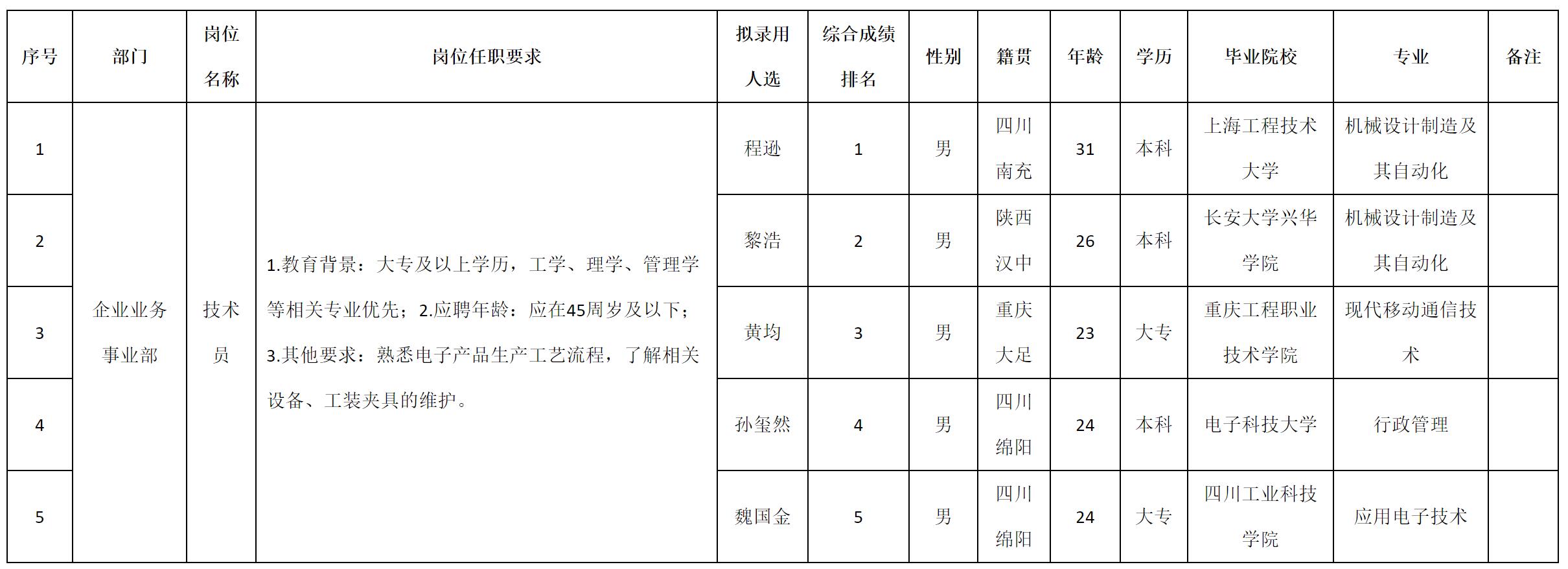 根據(jù)四川九州電子科技股份有限公司發(fā)布的招聘公告及招聘相關(guān)規(guī)定,經(jīng)測試、考察、體檢等程序,擬錄用程遜等5名同志到四川九州電子科技股份有限公司工作,現(xiàn)予以公示,具體情況如下: