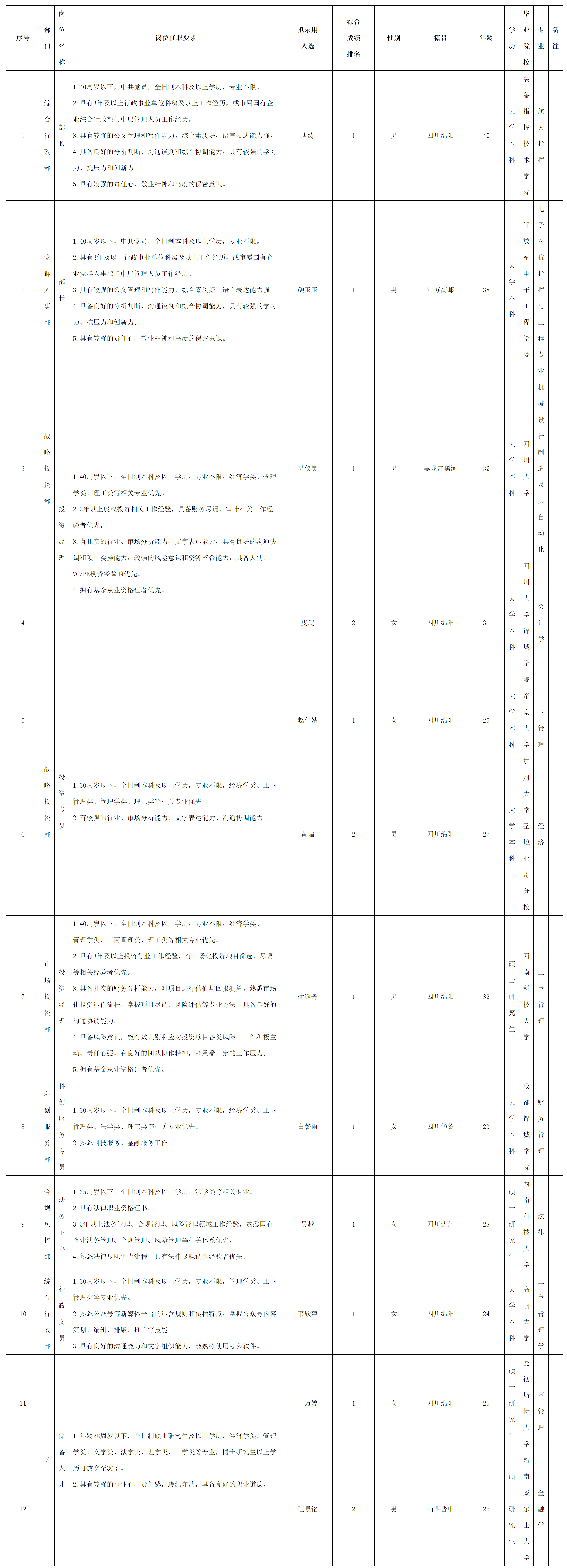 根據(jù)綿陽(yáng)科技城科技創(chuàng)新投資有限公司發(fā)布的第三批中層管理人員及員工招聘公告和招聘相關(guān)規(guī)定,經(jīng)筆試、面試、考察、體檢等程序,擬錄用唐濤、顏玉玉等12位同志到綿陽(yáng)科技城科技創(chuàng)新投資有限公司工作,現(xiàn)予以公示,具體情況如下: