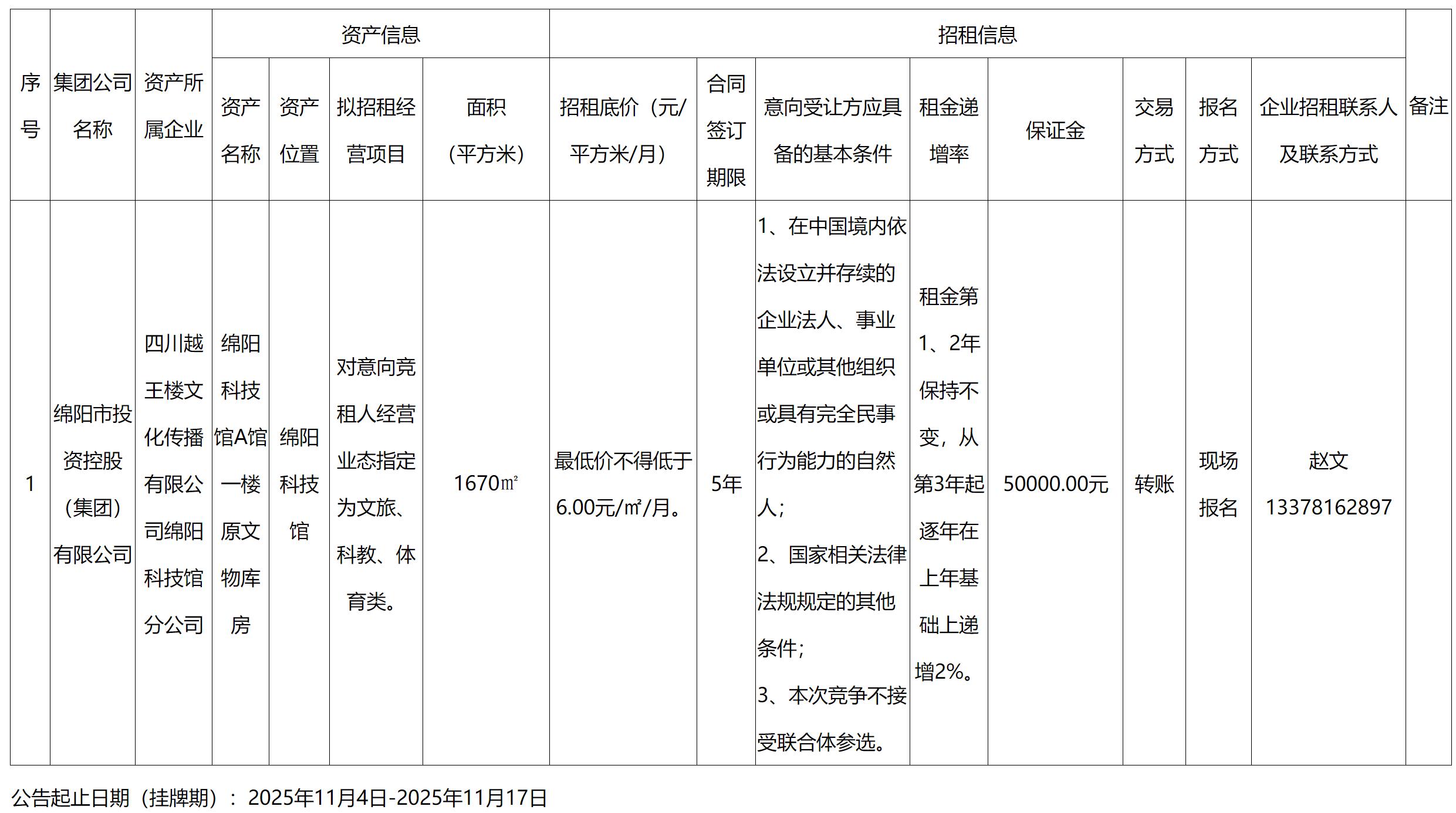 四川越王樓文化傳播有限公司綿陽(yáng)科技館分公司資產(chǎn)出租公告