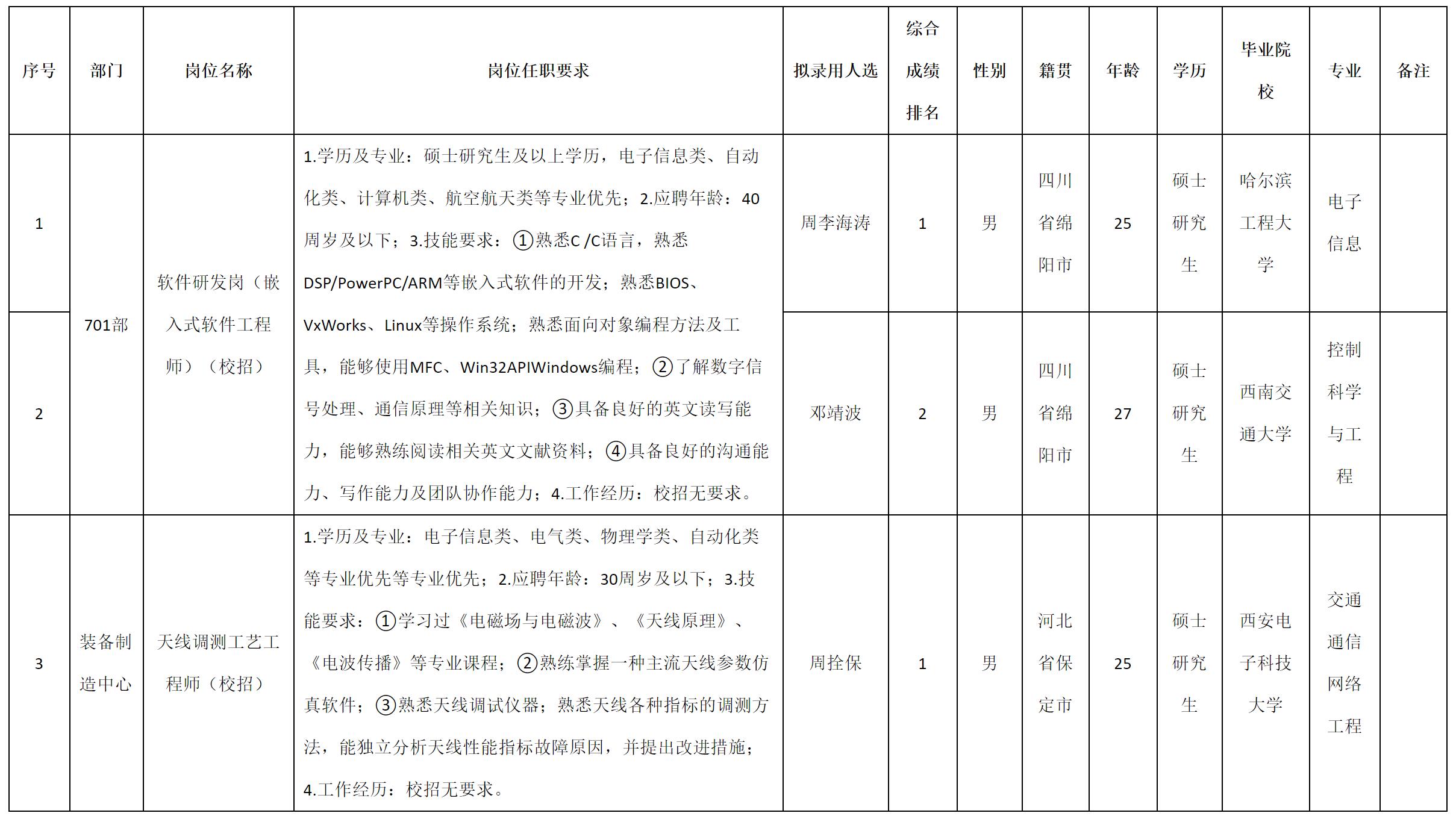 根據(jù)四川九洲電器集團(tuán)有限責(zé)任公司發(fā)布的招聘公告及招聘相關(guān)規(guī)定,經(jīng)測(cè)試、考察、體檢等程序,擬錄用周李海濤等3名同志到四川九洲電器集團(tuán)有限責(zé)任公司工作,現(xiàn)予以公示,具體情況如下: