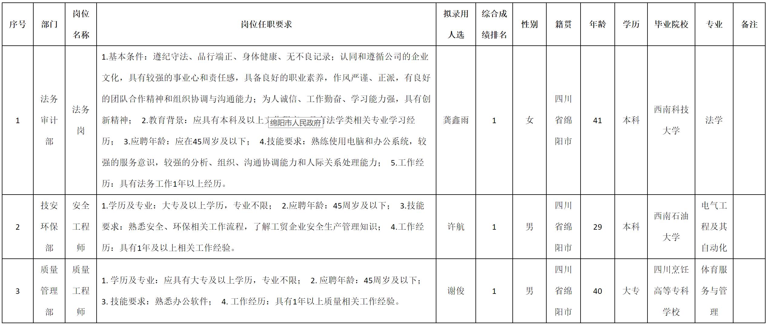 根據(jù)四川九州光電子技術(shù)有限公司發(fā)布的招聘公告及招聘相關(guān)規(guī)定,經(jīng)測試、考察、體檢等程序,擬錄用龔鑫雨等3名同志到四川九州光電子技術(shù)有限公司工作,現(xiàn)予以公示,具體情況如下: