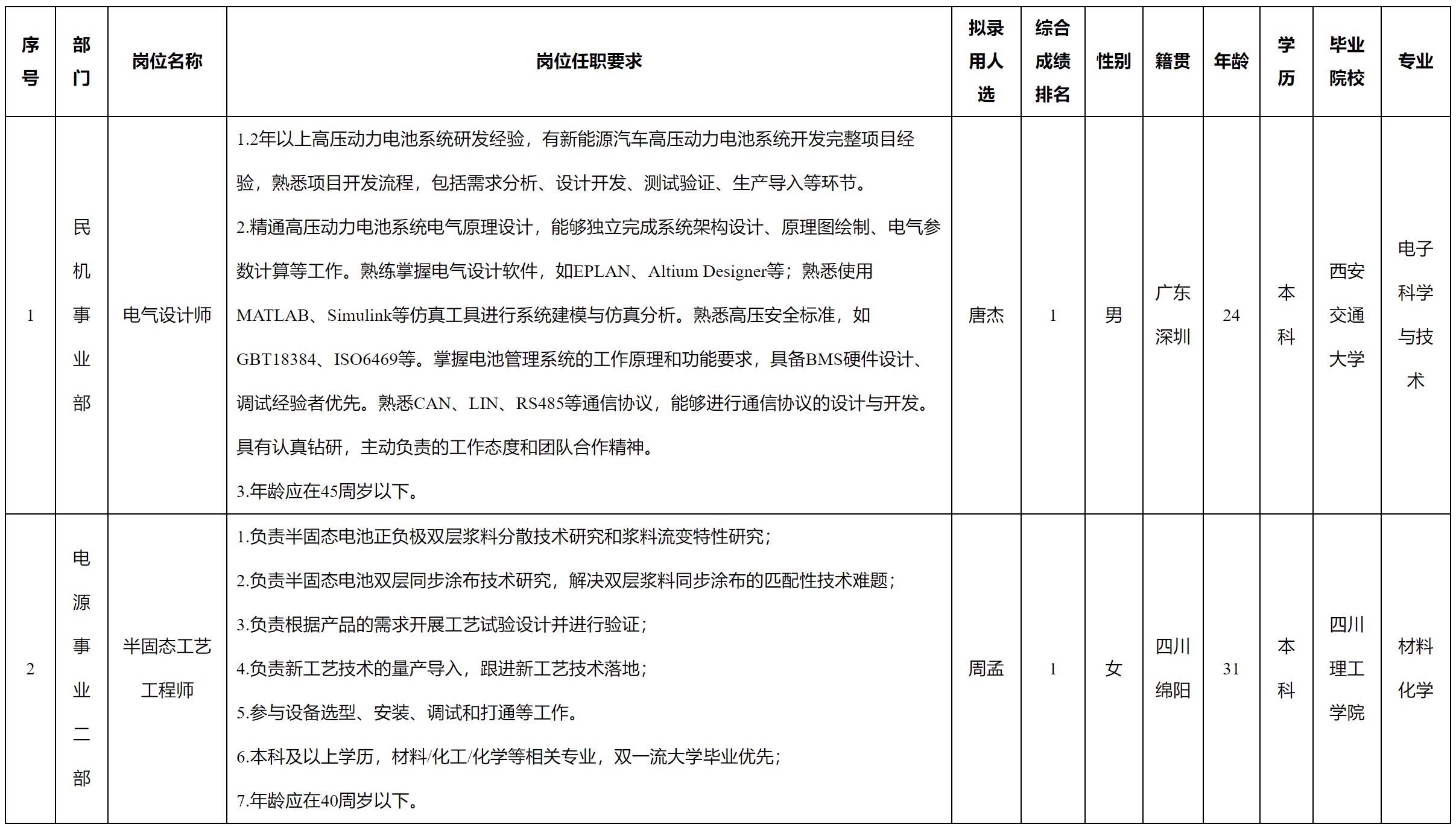 根據(jù)四川長(zhǎng)虹電源股份有限公司發(fā)布的招聘公告及招聘相關(guān)規(guī)定,經(jīng)測(cè)試、考察、體檢等程序,擬錄用唐杰、周孟同志到我司工作,現(xiàn)予以公示,具體情況如下: